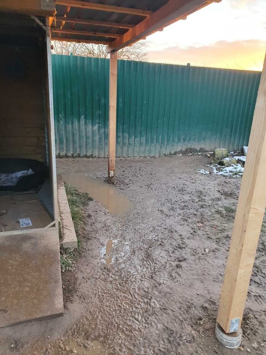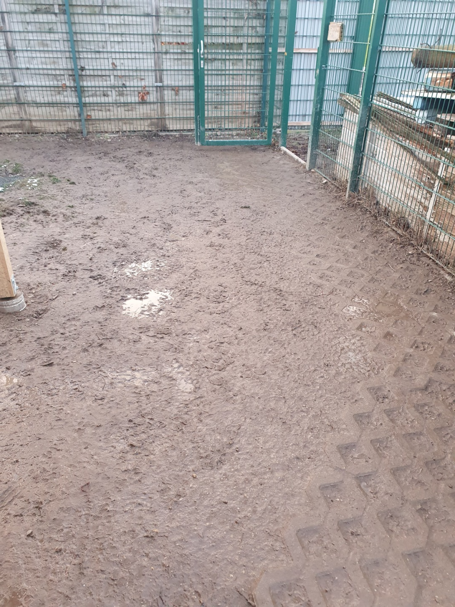 Ohne Gras, ja das ist natürlich schön im Frühjahr und überhaupt natürlicher - aber bei Nutzung der Ausläufe auch sehr schnell zertrampelt und verbuddelt. Besonders schlimm war auch, dass die Hunde im Herbst, Winter dann dauerhaft nass und schlammig waren.